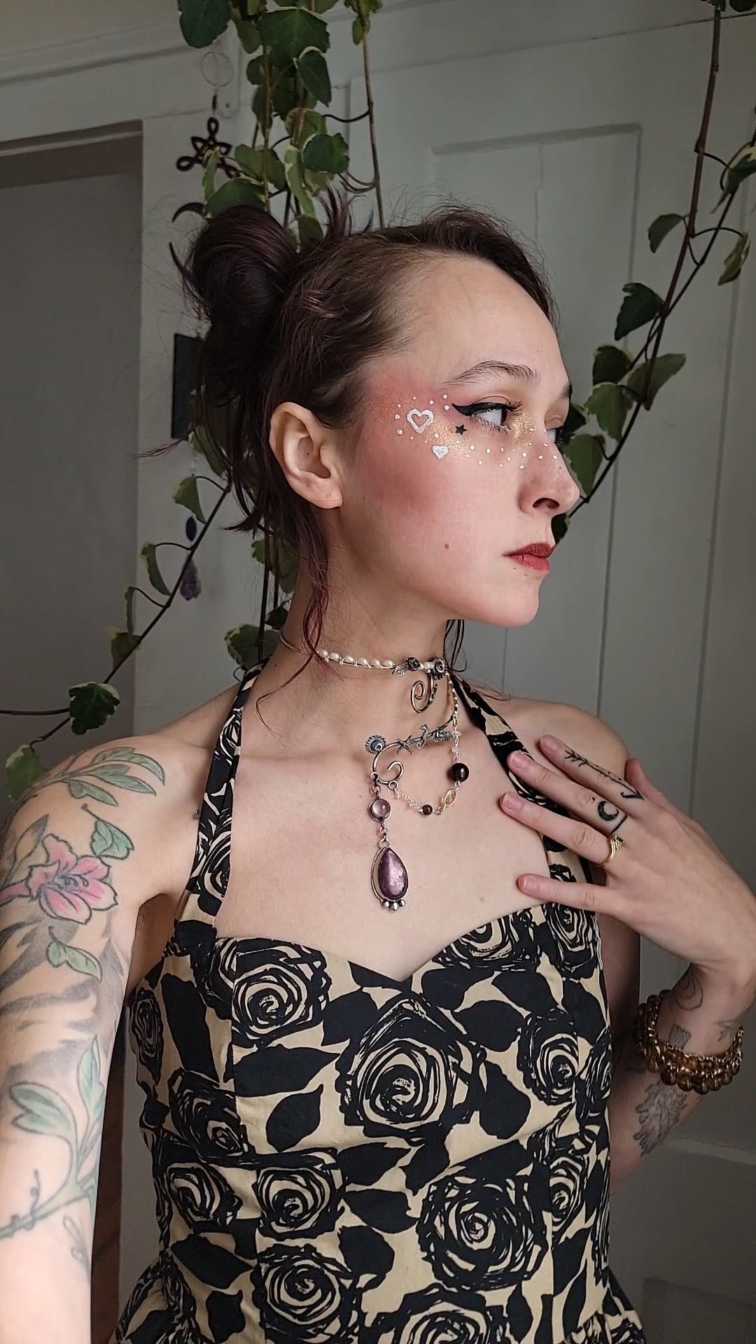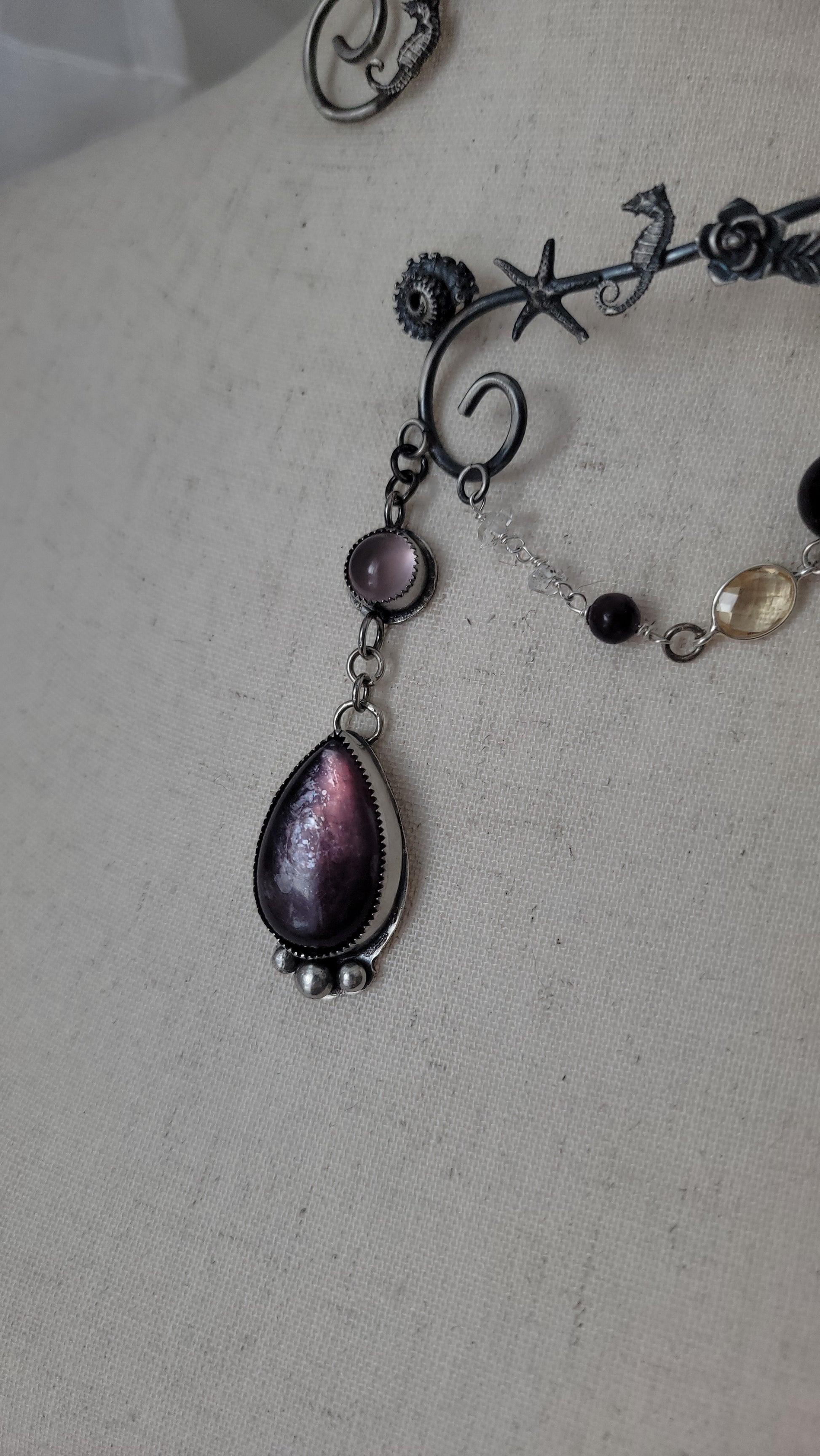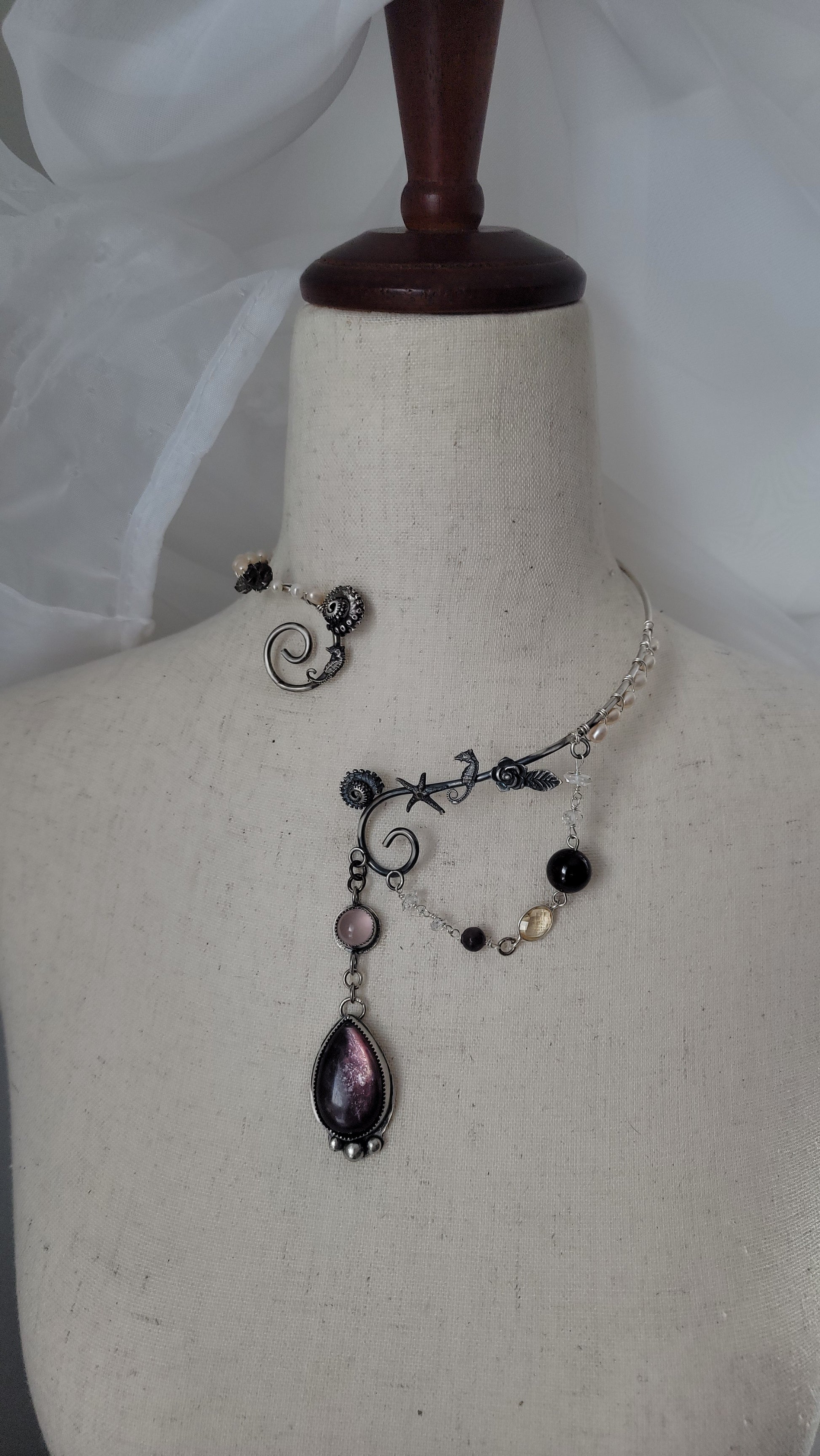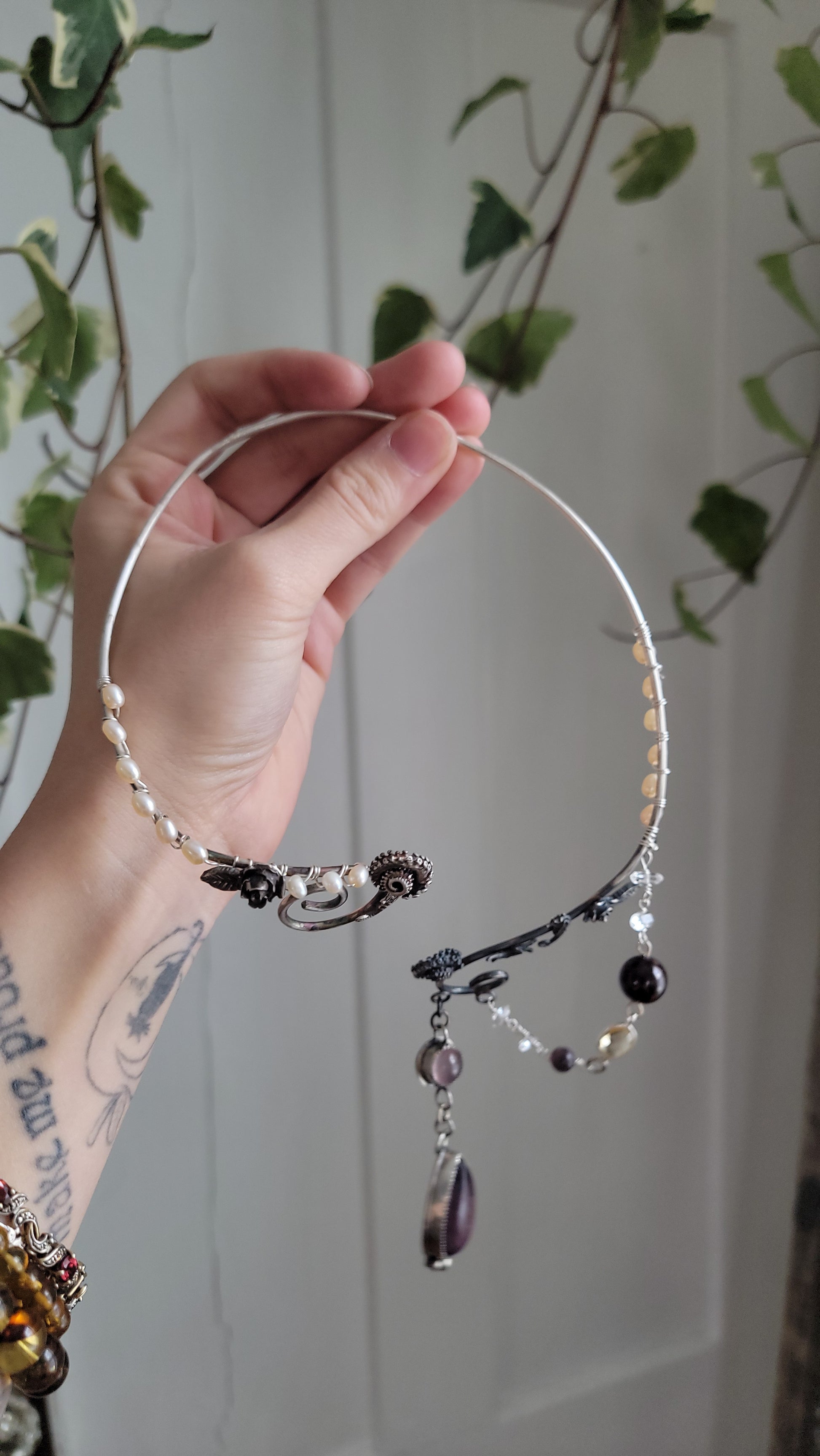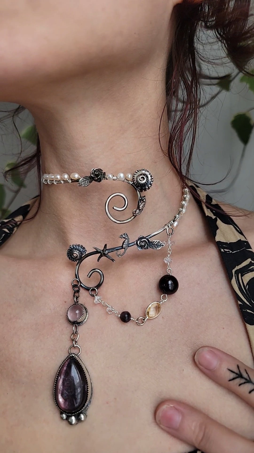 This piece is one of my most aggressive to date with so many components that pushed me out of my comfort zone in the best way possible. Each metal component is sterling silver, accented with wire wrapped pearl beads, herkimers, gemmy garnet, lepidolite and citrine, and finished with a gemmy lepidolite cab and Mozambique rose quartz cabochon. On the choker part itself there are several sterling silver castings such as octopus tentacles, seahorses, starfish, and rose to bring the ocean energy into this piece for a soft and elegant venus vibe look. The choker consists of 10 gage sterling silver wire that has been anealed enough to hold its shape but still has some bend to it for the wearer to crimp and pull where they see fit for their own aesthetic. Let me answer some questions that are bound to come up: