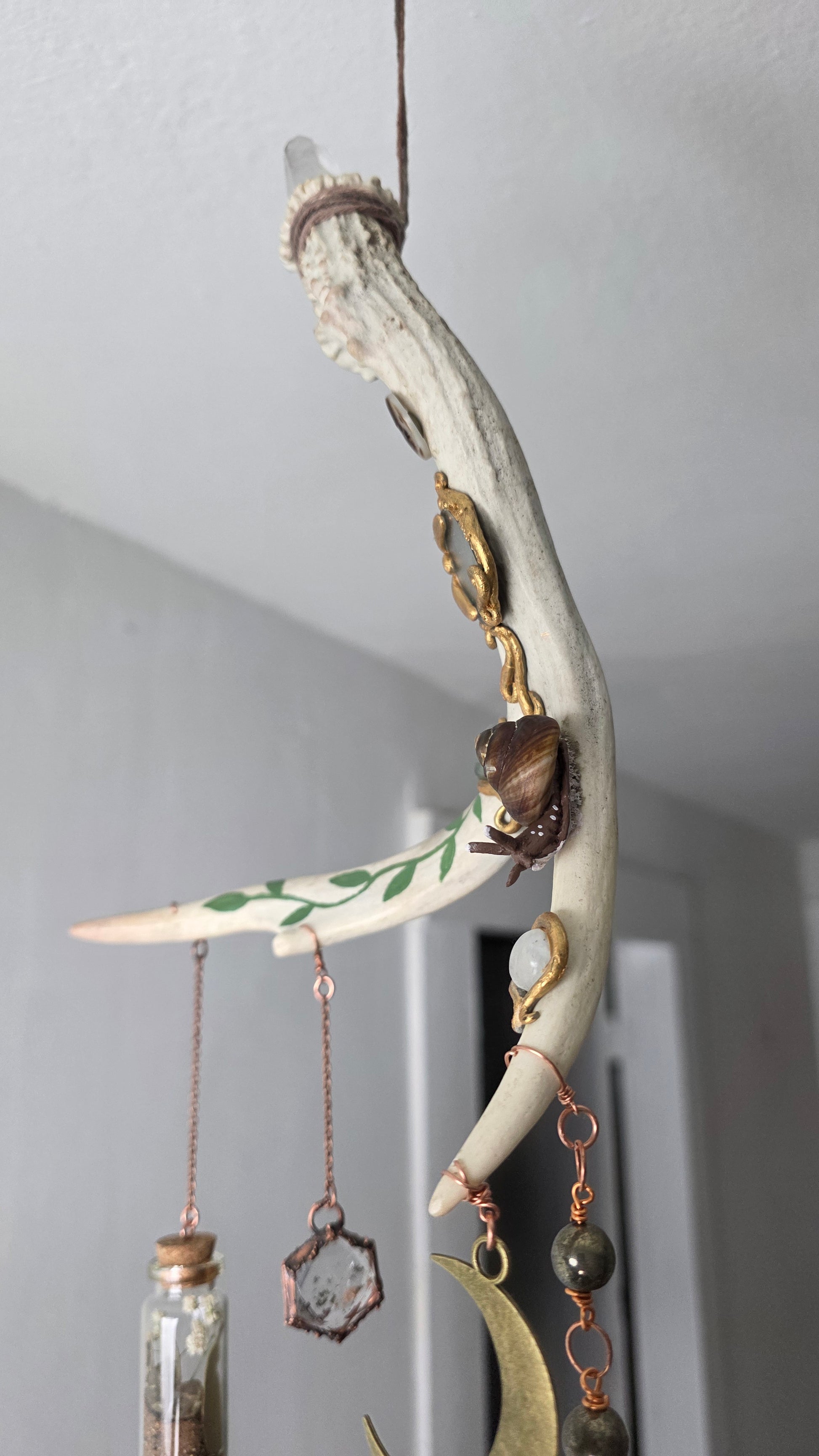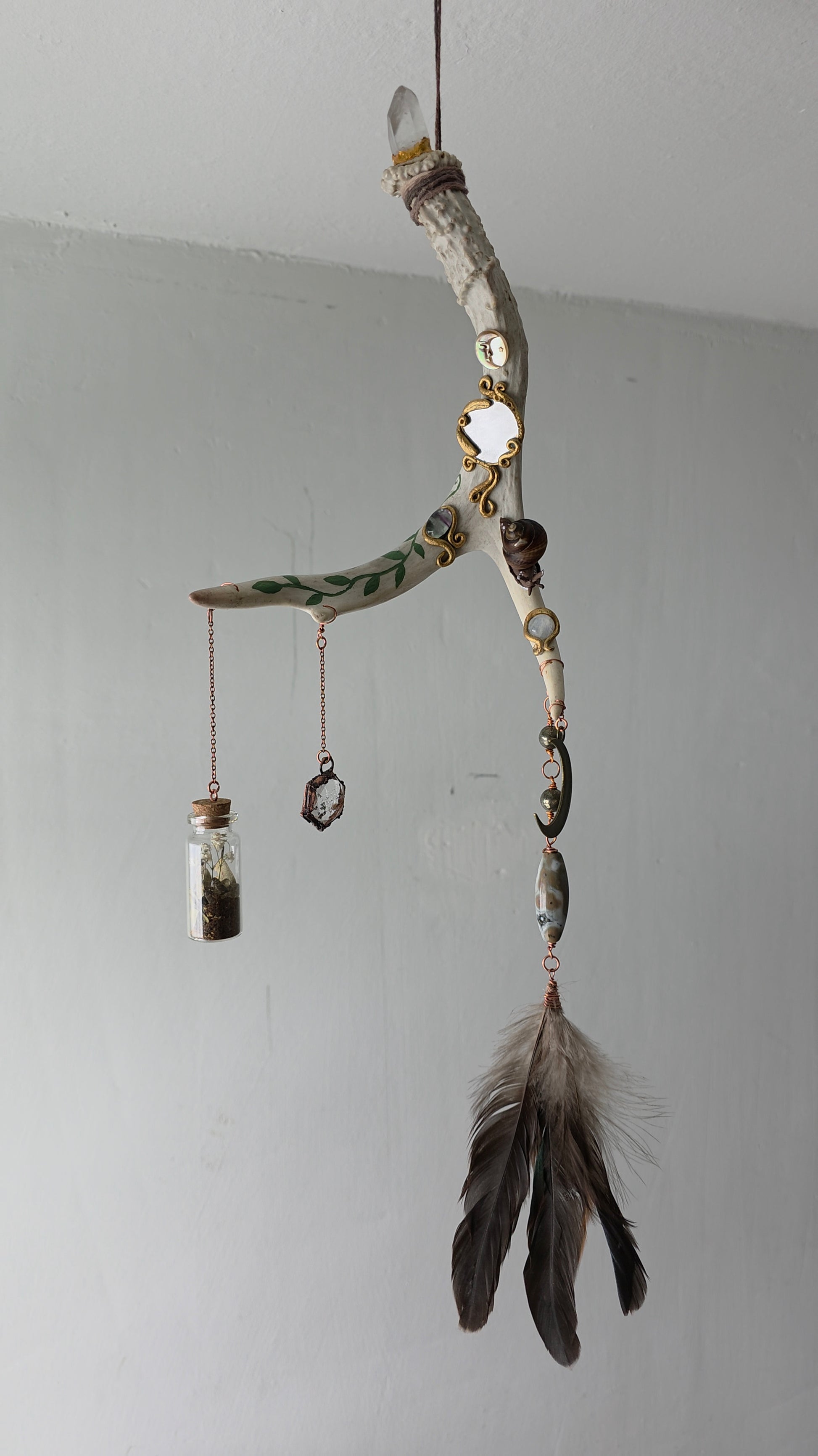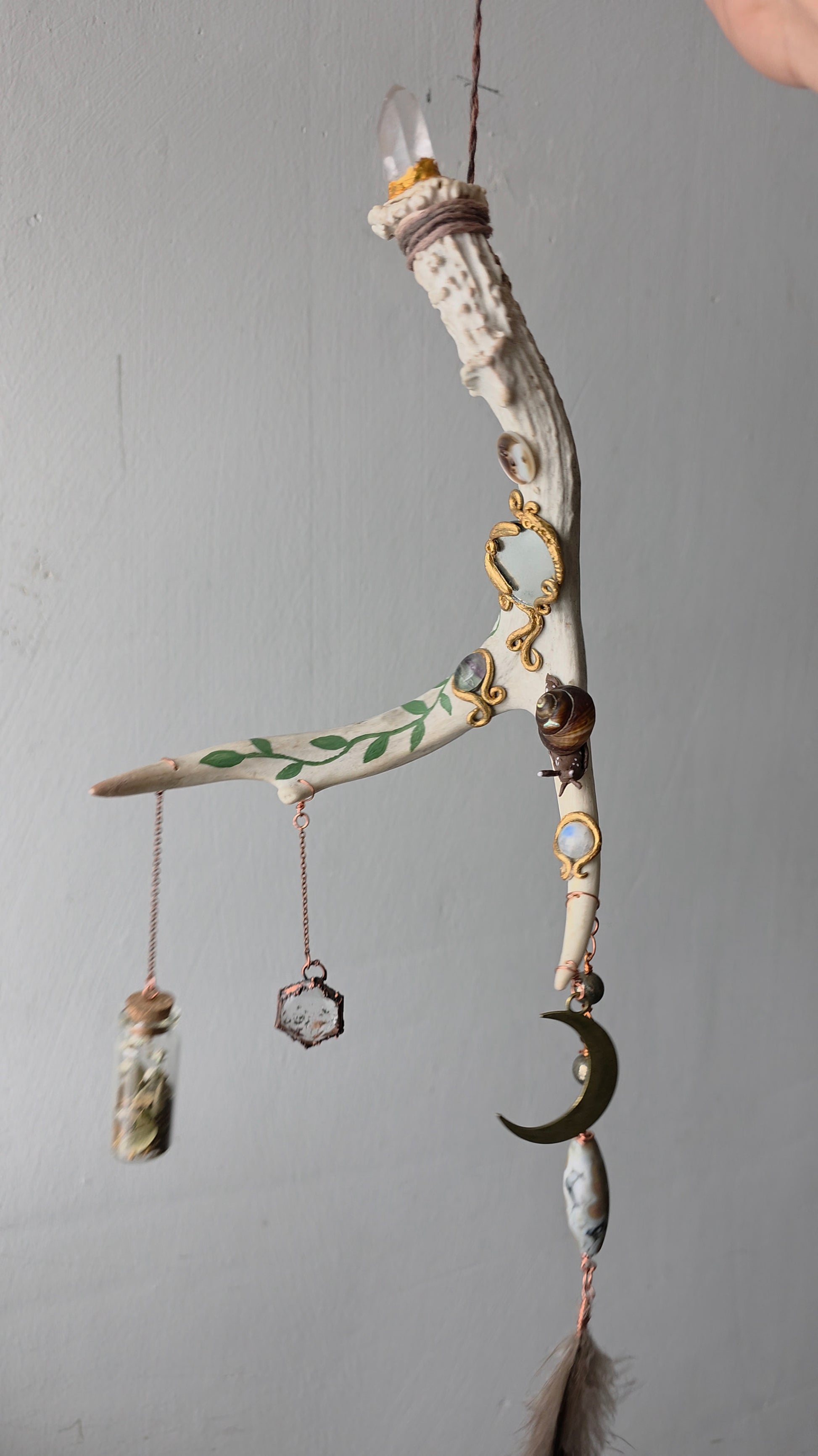 A natural deer Antler shed that has been adorned with hand sculpted features, real crystals, snail shell, and a mirror, with dangling accents and a protection spell bottle. This piece has been carefully crafted over several months slowly to bring its spirit to life, and hand painted carefully with acrylic paint. It features moonstone, fluorite, quartz, mother of pearl, garden quartz, pyrite, and ocean jasper. The spell jar has been sealed.