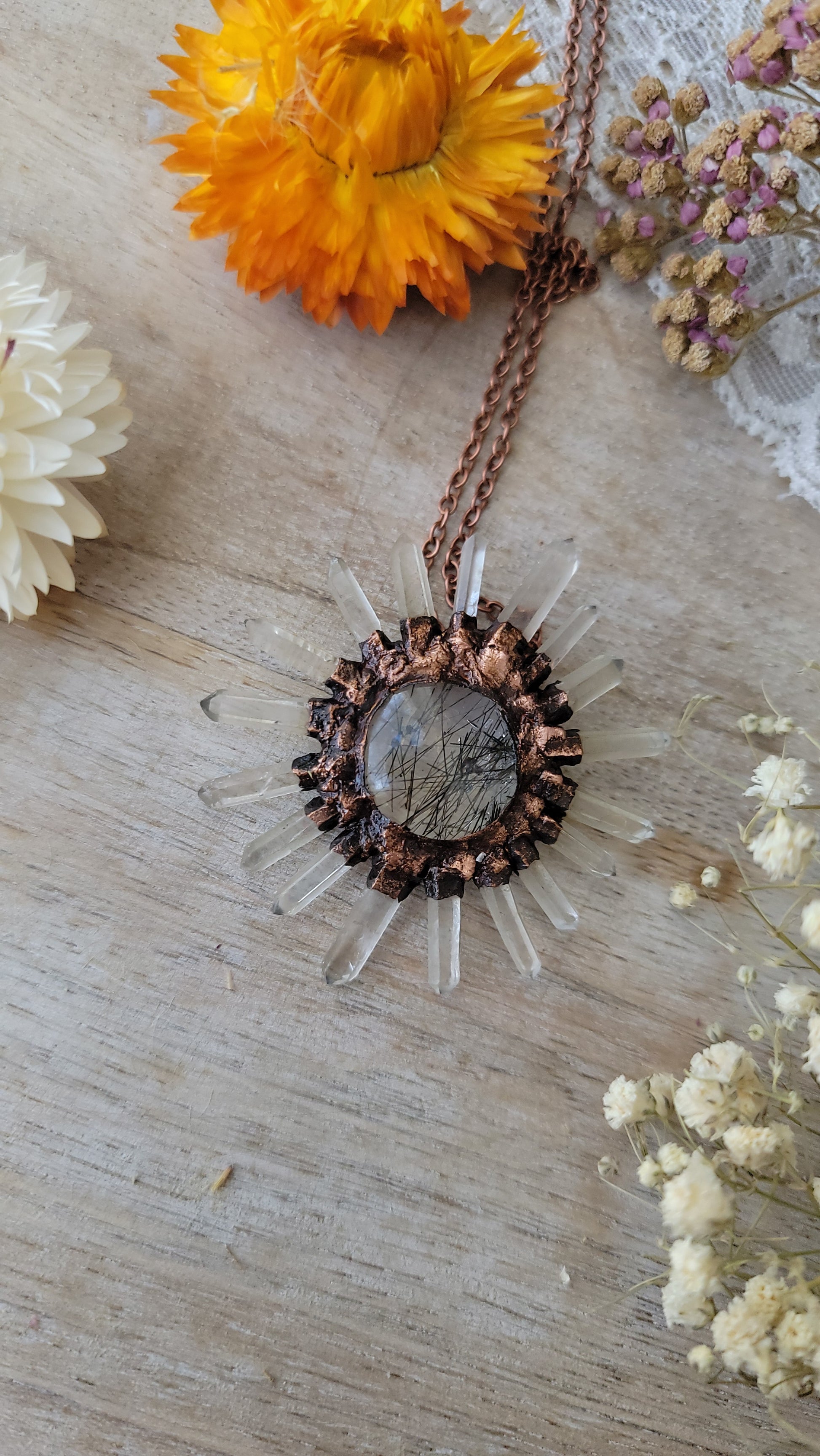 Tourmalinated Quartz Copper Sun Necklace