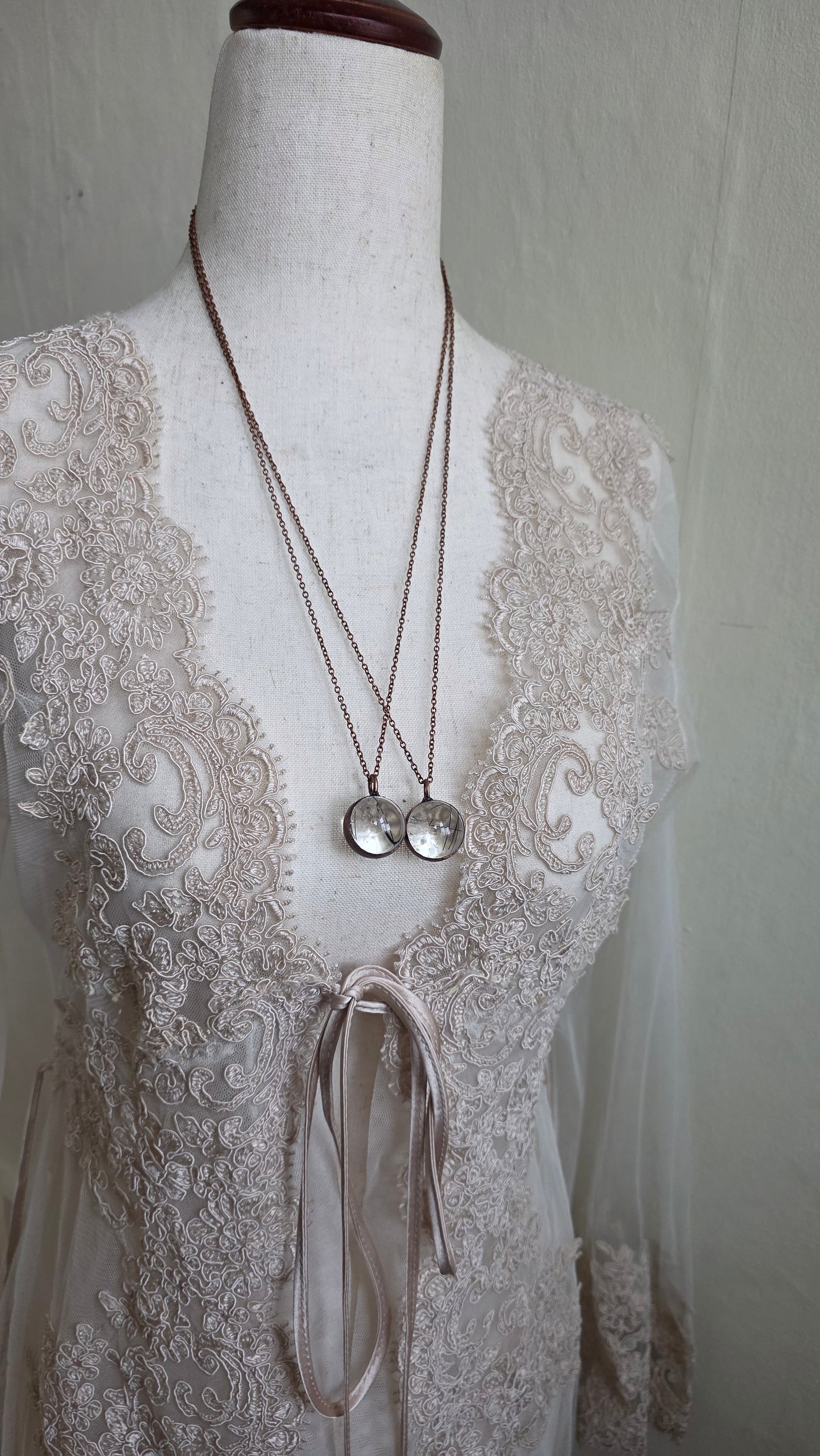 This listing is for one tourmalinated quartz sphere copper pendant that you can choose from the variations when adding to your cart. These are made using a technique known as electroforming and the copper has been darkened with a patina to give it an antiqued look. These come on 24" of antiqued copper chain with a simple clasp. If you have any questions or concerns about these please contact me before purchasing thank you!