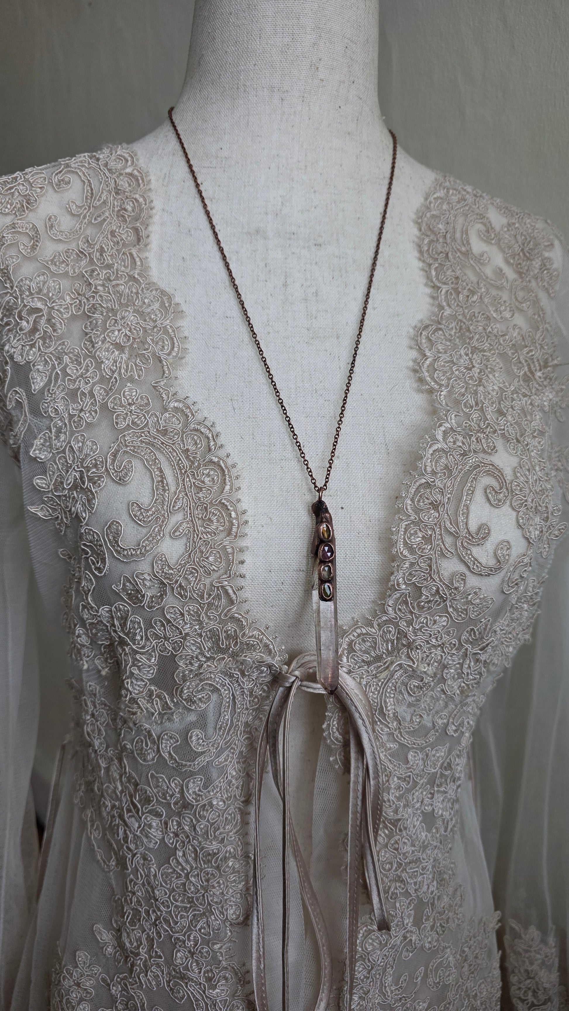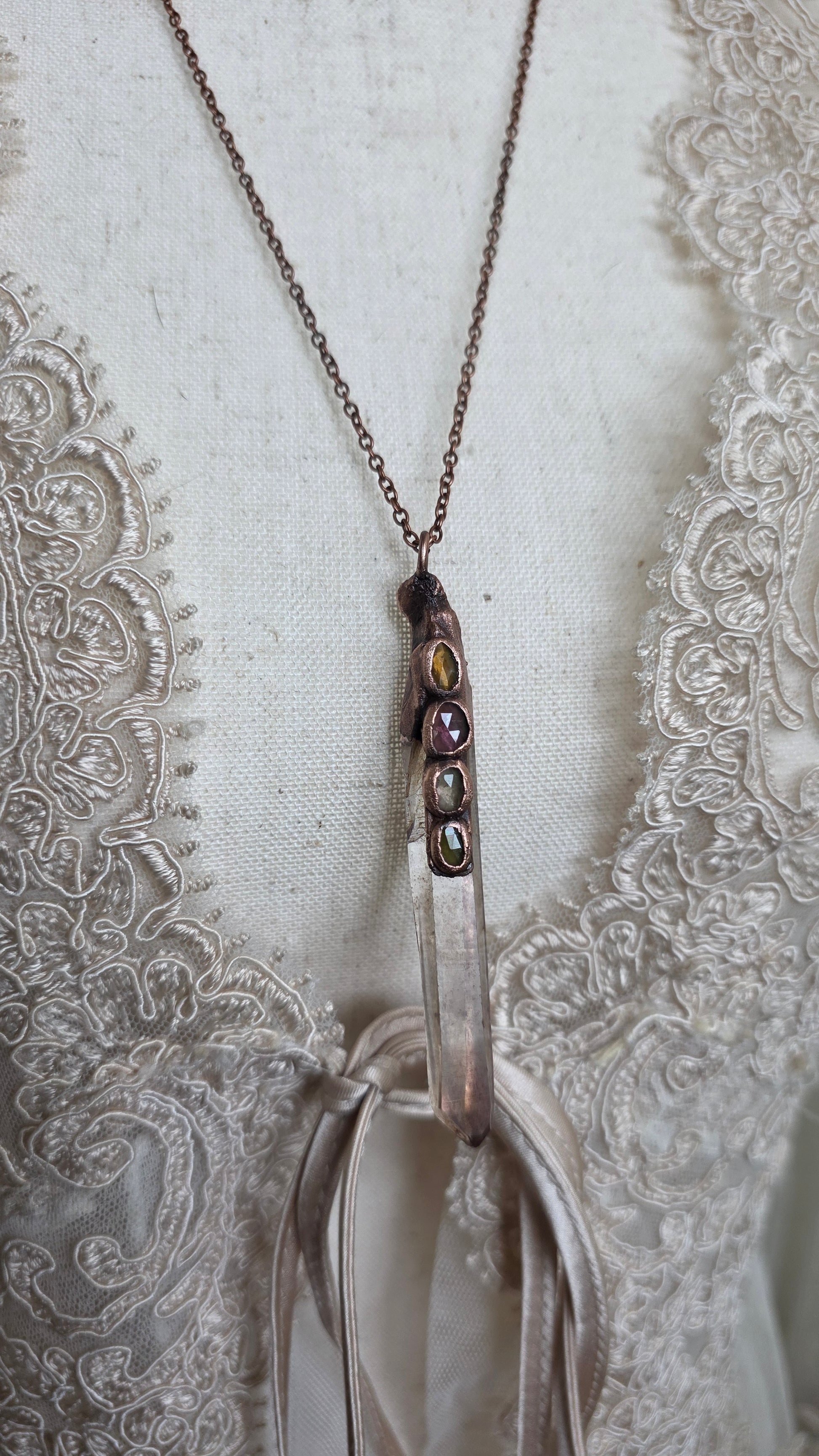 A gorgeous natural singing smokey quartz point adorned with multiple colored faceted tourmaline and coated in copper using a technique known as electroforming. The copper on this piece has been darkened with a patina to give it an antiqued look and this comes on 24" of antiqued copper chain with a simple clasp. If you have any questions or concerns about this piece please contact me before purchasing thank you!