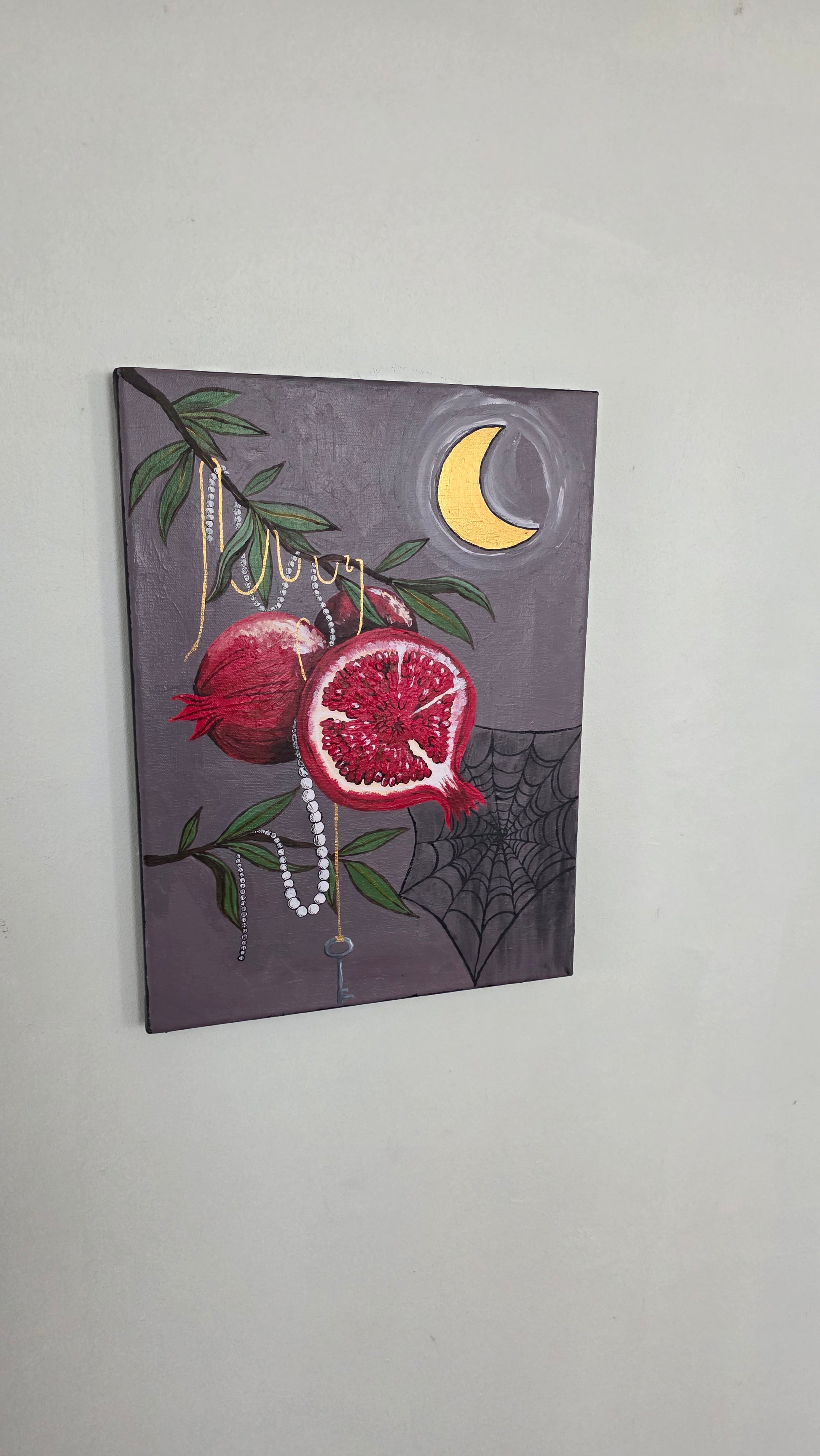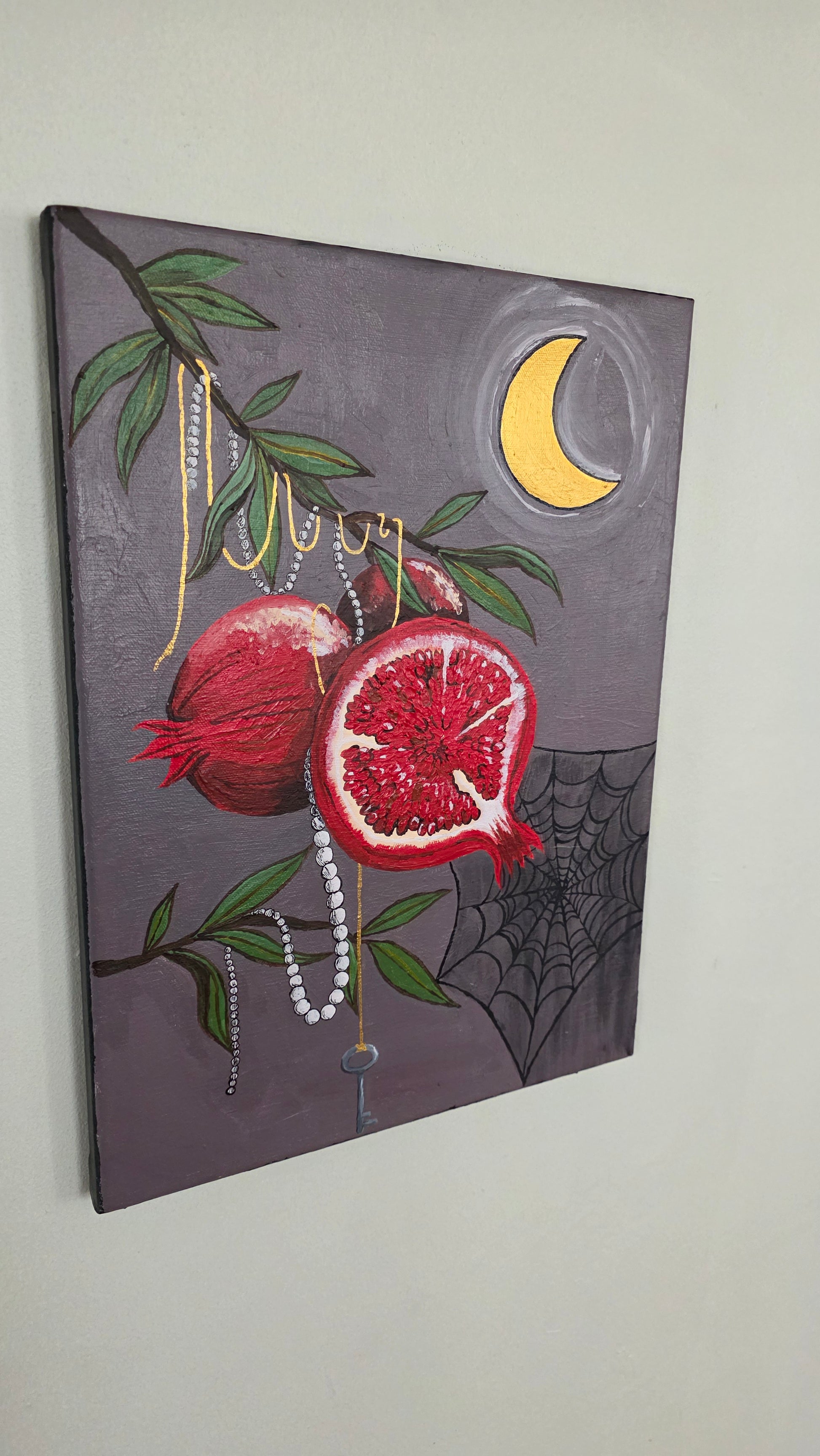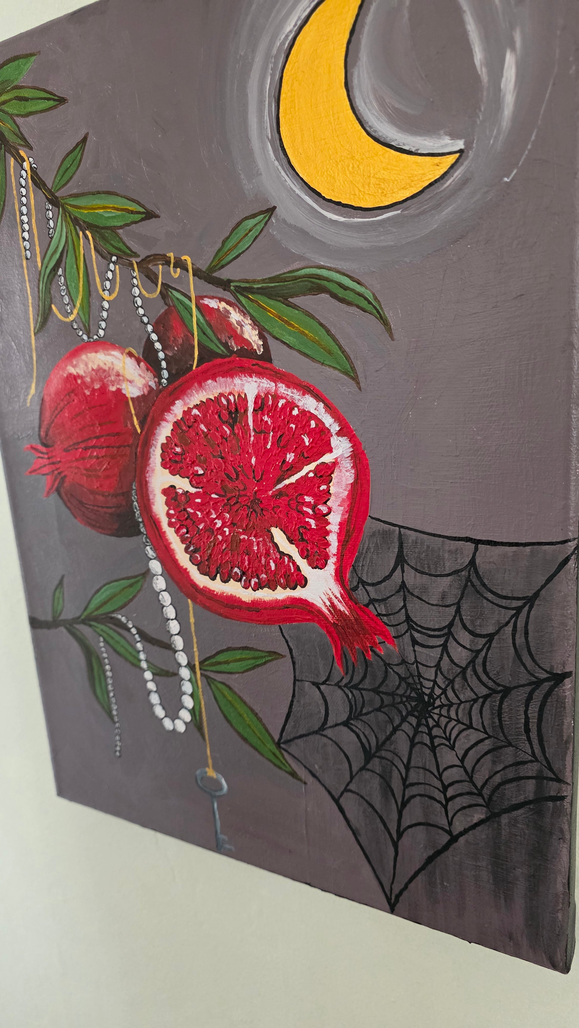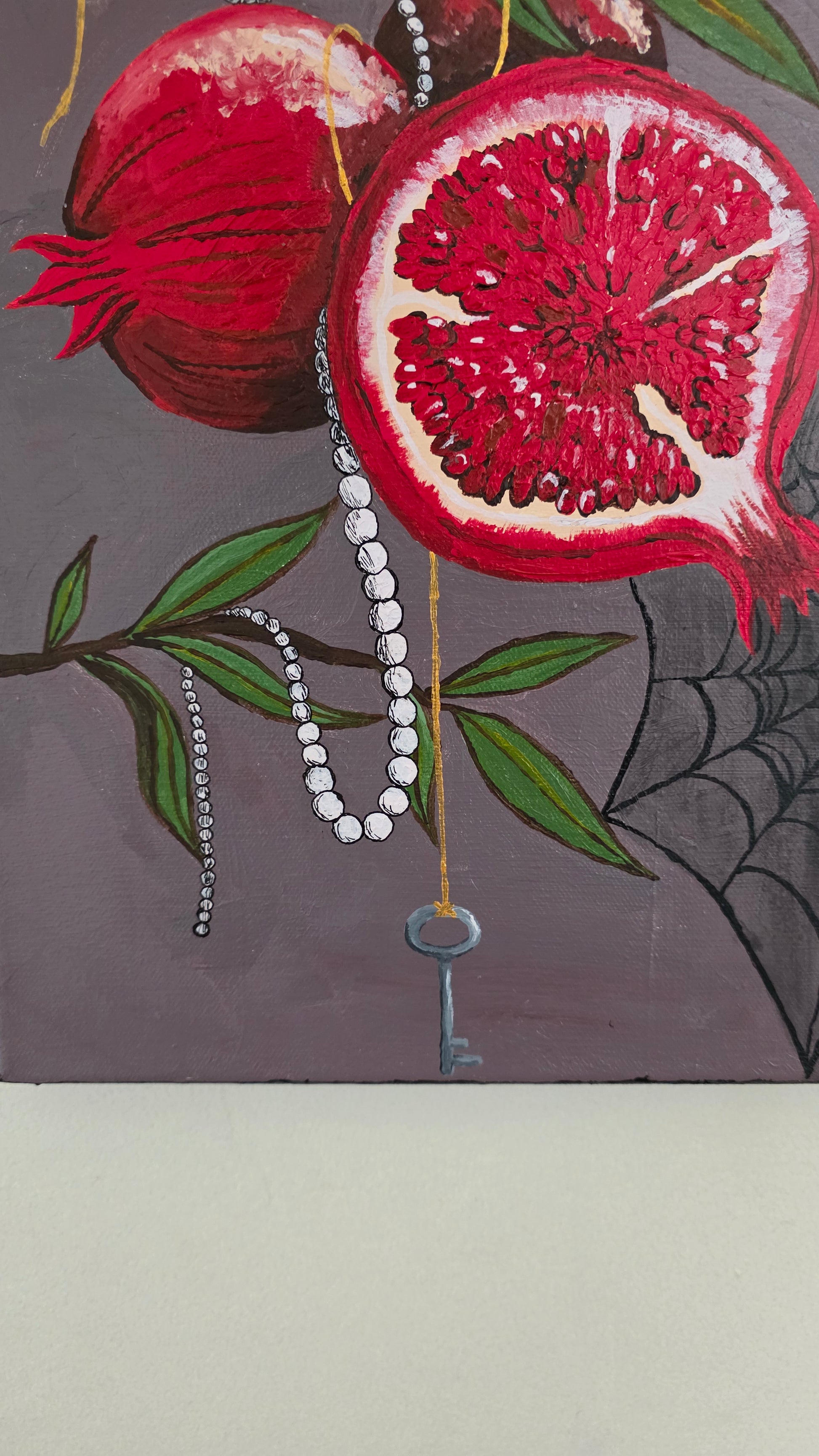 Innocence given is a symbolic piece done to represent the choices we make in giving up our Innocence at different intervals in our lives. An ode to the tempting pomegranates from the story of Hades and Persephone, with Gold acrylic paint threads to represent The Fates and the holder of the key to secrets. Pearl strands for their symbolism in romance since they are often a representation of a woman who has felt her Innocence given in exchange for jewelry, even if they stand for purity and elegance.
