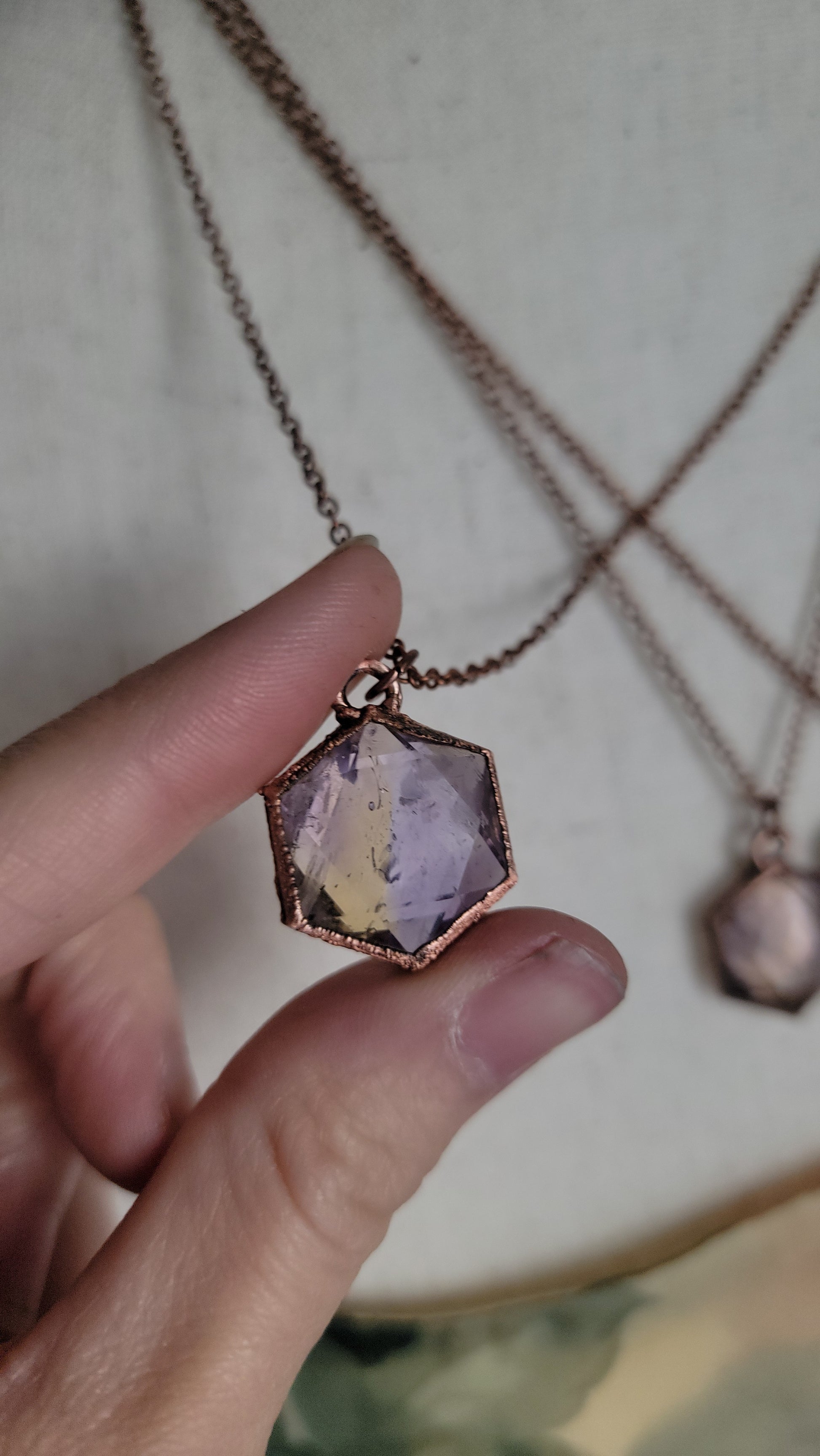 This listing is for ONE ametrine hexagon copper necklace that you can choose from the variations when adding to your cart. The copper on these has been darkened with a patina to give them an antiqued look and this comes on 18" of antiqued copper chain with a simple clasp. If you have any questions or concerns about this piece please contact me before purchasing thank you!