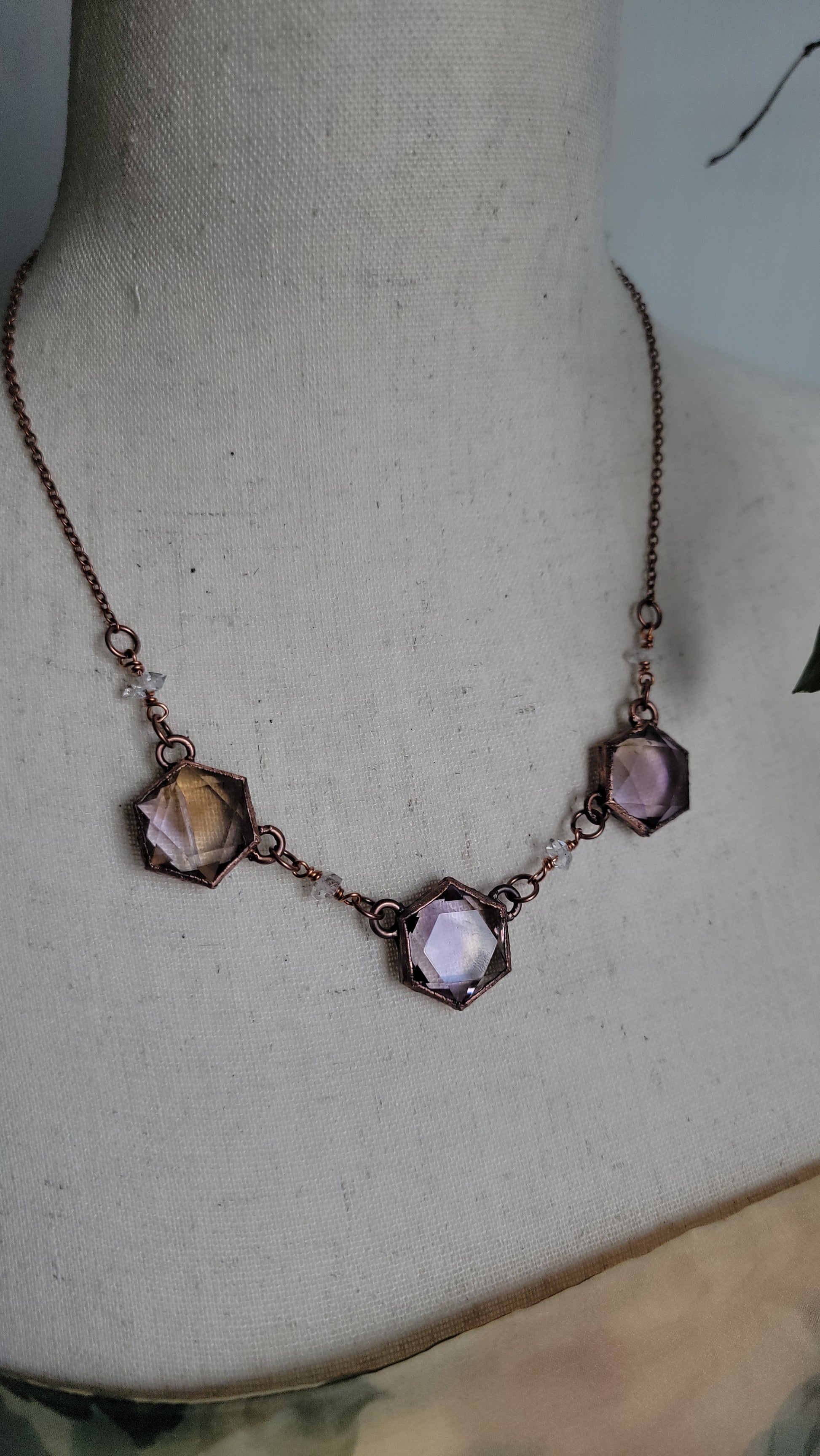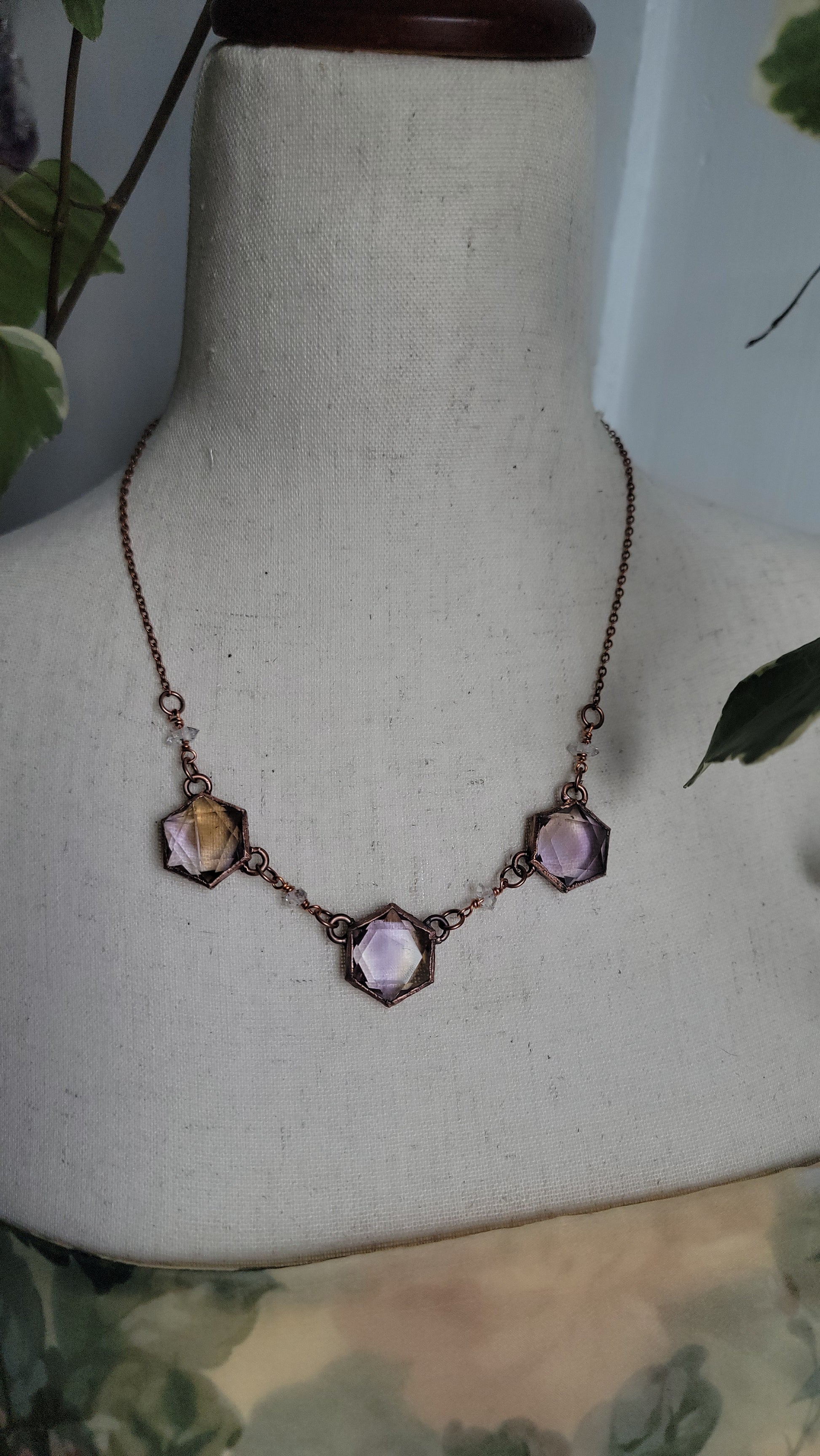 Three stunning ametrine hexagons coated in copper using a technique known as electroforming. The copper on these pieces has been darkened and in between each hexagon is a simple wire wrapped herkimer quartz. This is finished with antiqued copper chain with a simple clasp and is approximately 16-17" in length. If you have any questions or concerns about this piece please contact me before purchasing thank you!